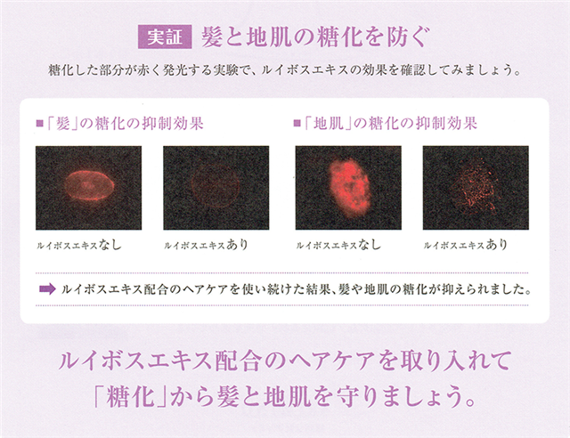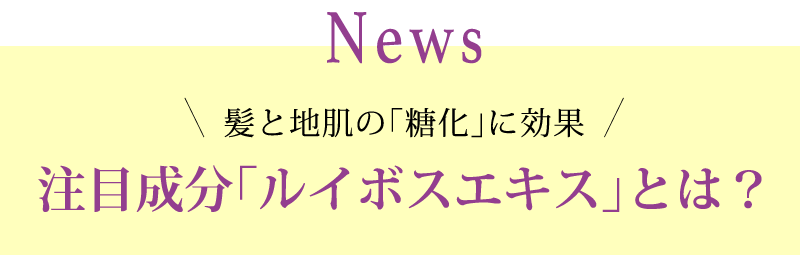ルイボスは、南アフリカに自生する落葉亜低木で、ハーブの一種。ルイスティーは、ミネラルをバランス良く含み、美容と健康に良いことで知られています。ルイボスから抽出した「ルイボスエキス」には、髪と地肌の糖化をストップさせる働きがあります。 |