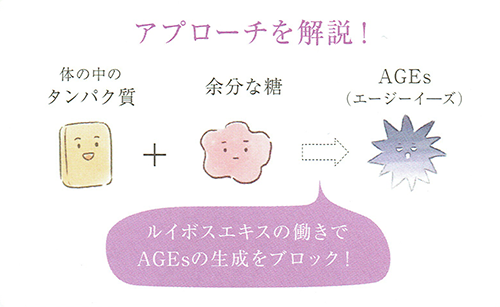毎日の食事で摂った「糖」が体内の「タンパク質」と結びつき、老化物質「AGEs」に化けて、