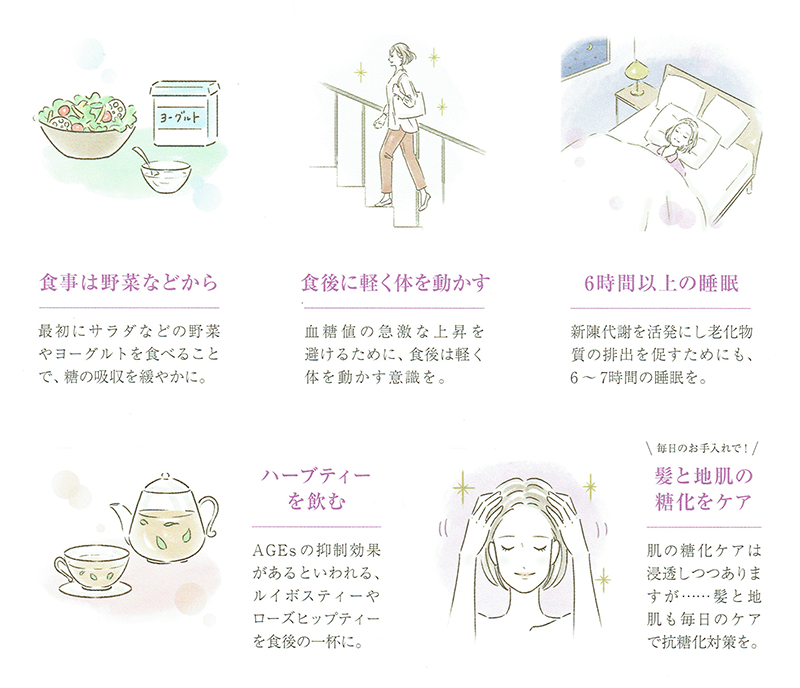「糖化」を抑えて、老化現象の加速をストップするためには、食事の摂り方をはじめ、日々の生活習慣が大切です。 |